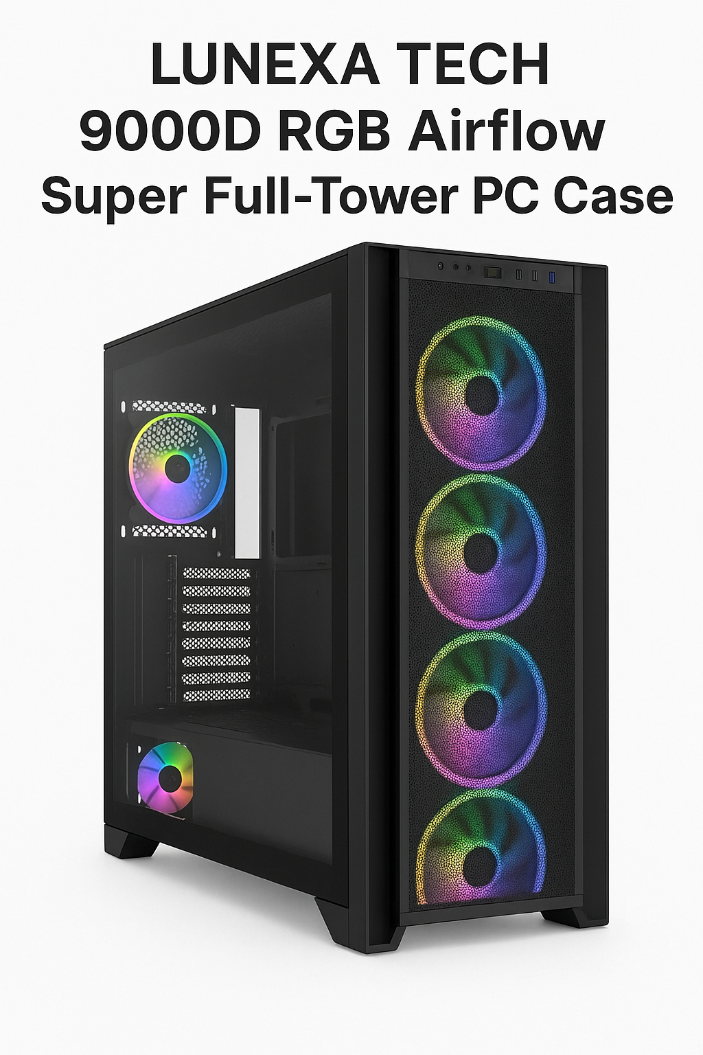 Experience the ultimate in PC case engineering with the Lunexa Tech 9000D RGB Airflow Super Full-Tower PC Case. Designed for gamers, streamers, and high-performance system builders, this case combines cutting-edge airflow design with stunning RGB lighting for a perfect balance of performance and aesthetics.