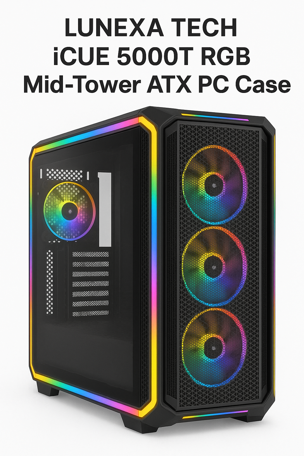 Designed for builders who demand style without compromising performance, the Lunexa Tech iCUE 5000T RGB Mid-Tower delivers cooling flexibility, stunning aesthetics, and next-level customization—all in a refined mid-tower form factor.