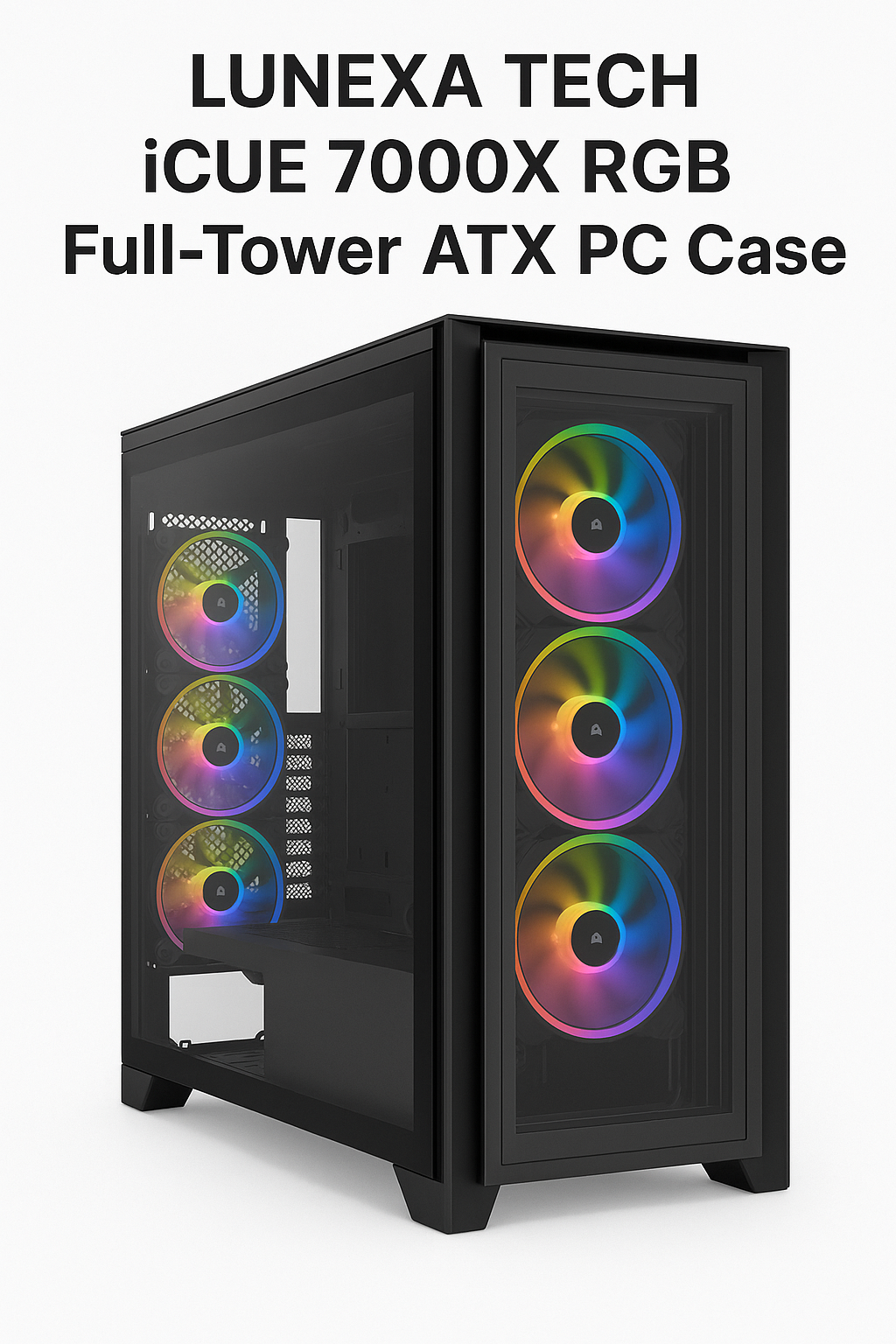 Unleash your creativity with the Lunexa Tech iCUE 7000X RGB Full-Tower ATX PC Case, designed for builders who want the perfect blend of power, airflow, and aesthetics. Crafted with premium materials, this case provides a spacious interior to accommodate E-ATX motherboards, multiple GPUs, and advanced liquid-cooling solutions with ease.